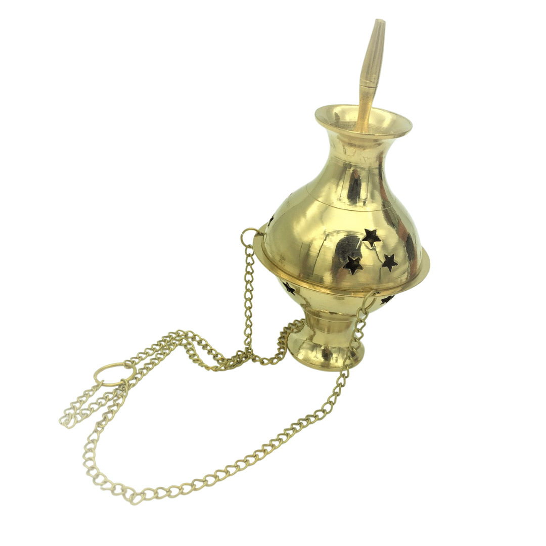 This beautiful brass hanging incense censer is hand crafted, and ideal for Ceremonial work. By Consecrating and Purifying the Circle, we define it as Sacred for the work we are there to do during a Ceremony.